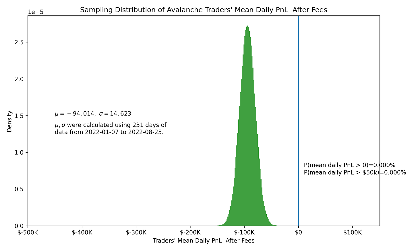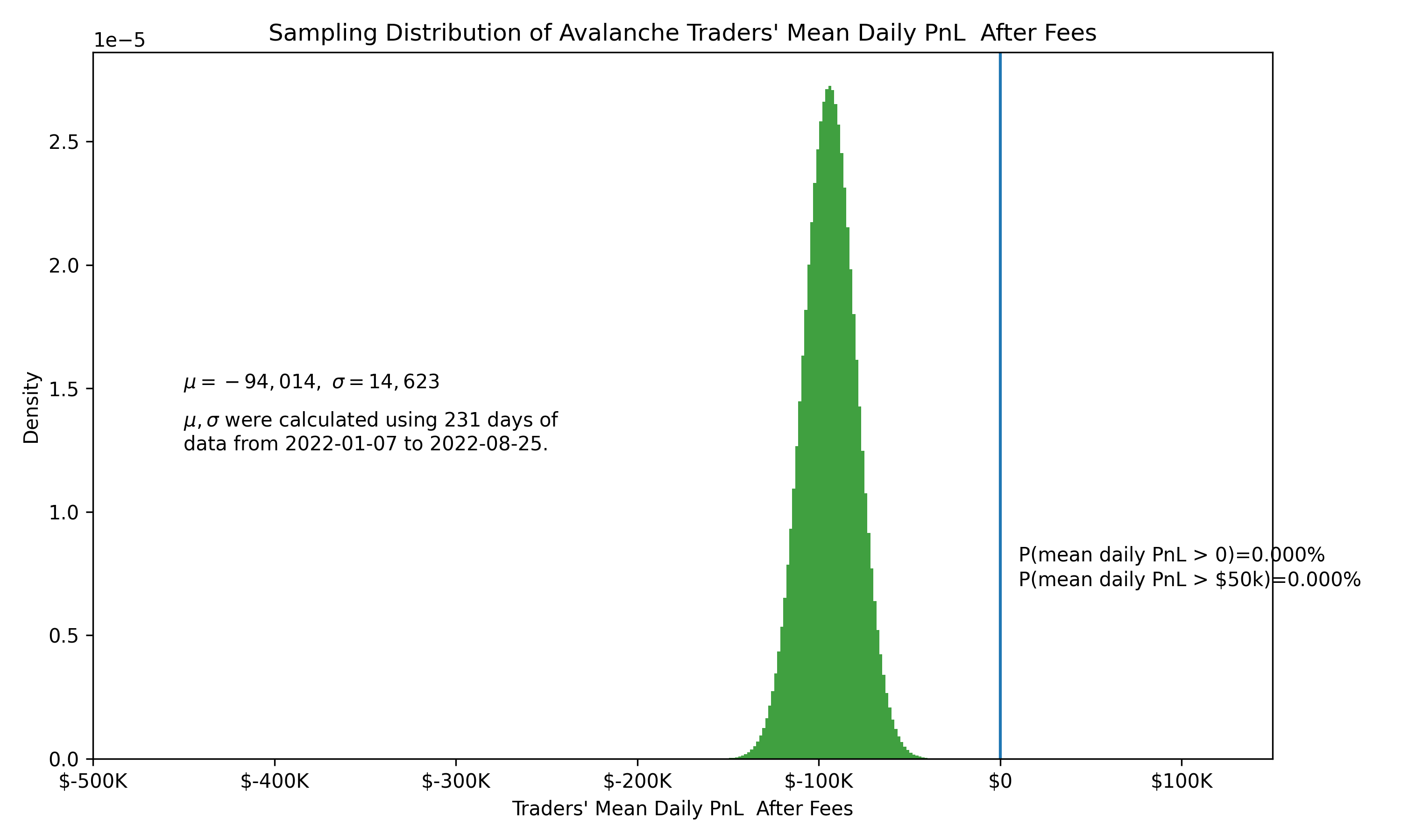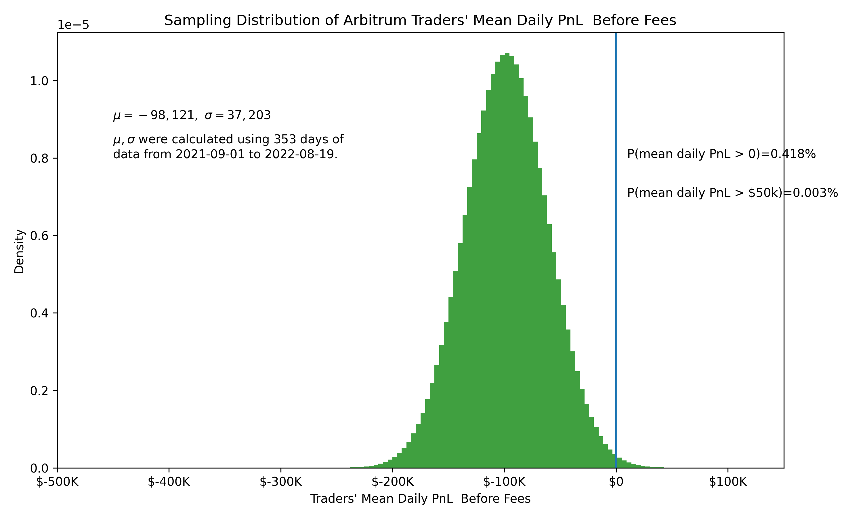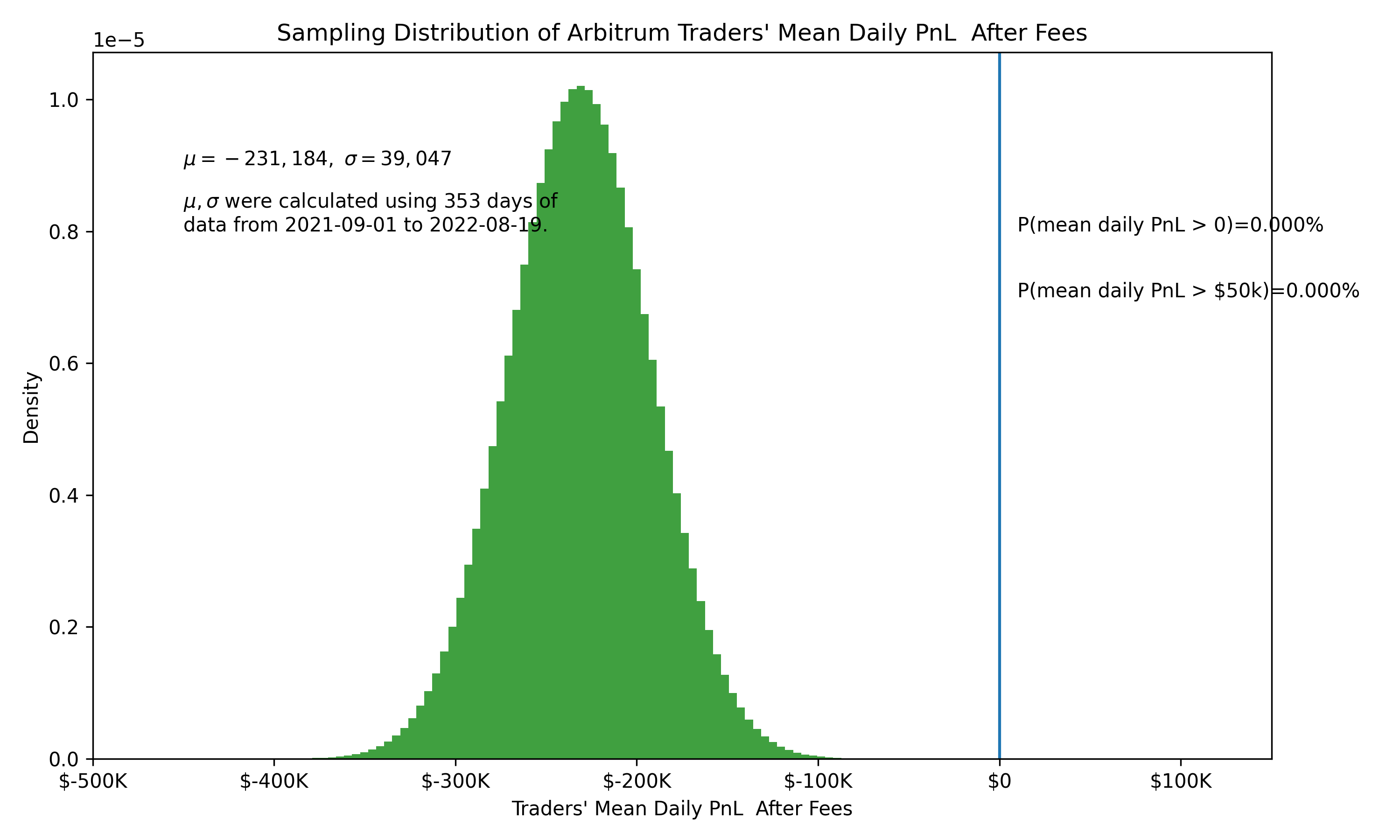 Before accounting for borrow and liquidation fees, for every 1,000 simulations of possible futures, there are ~7 of them where traders will on average make money. Yet the chances of traders on average making more than $50K per day is almost zero.