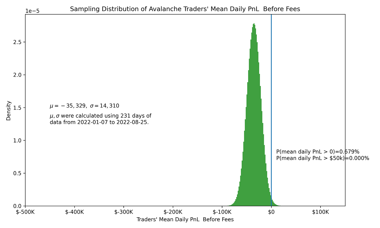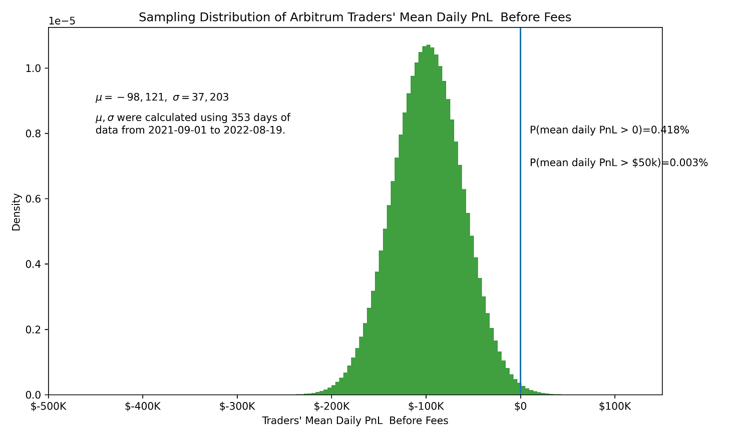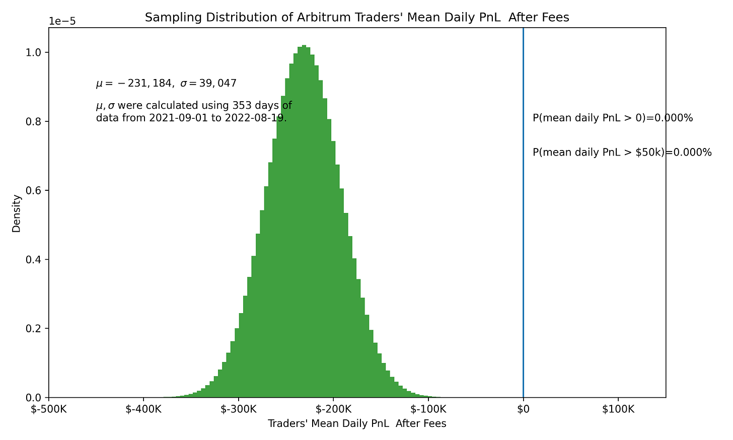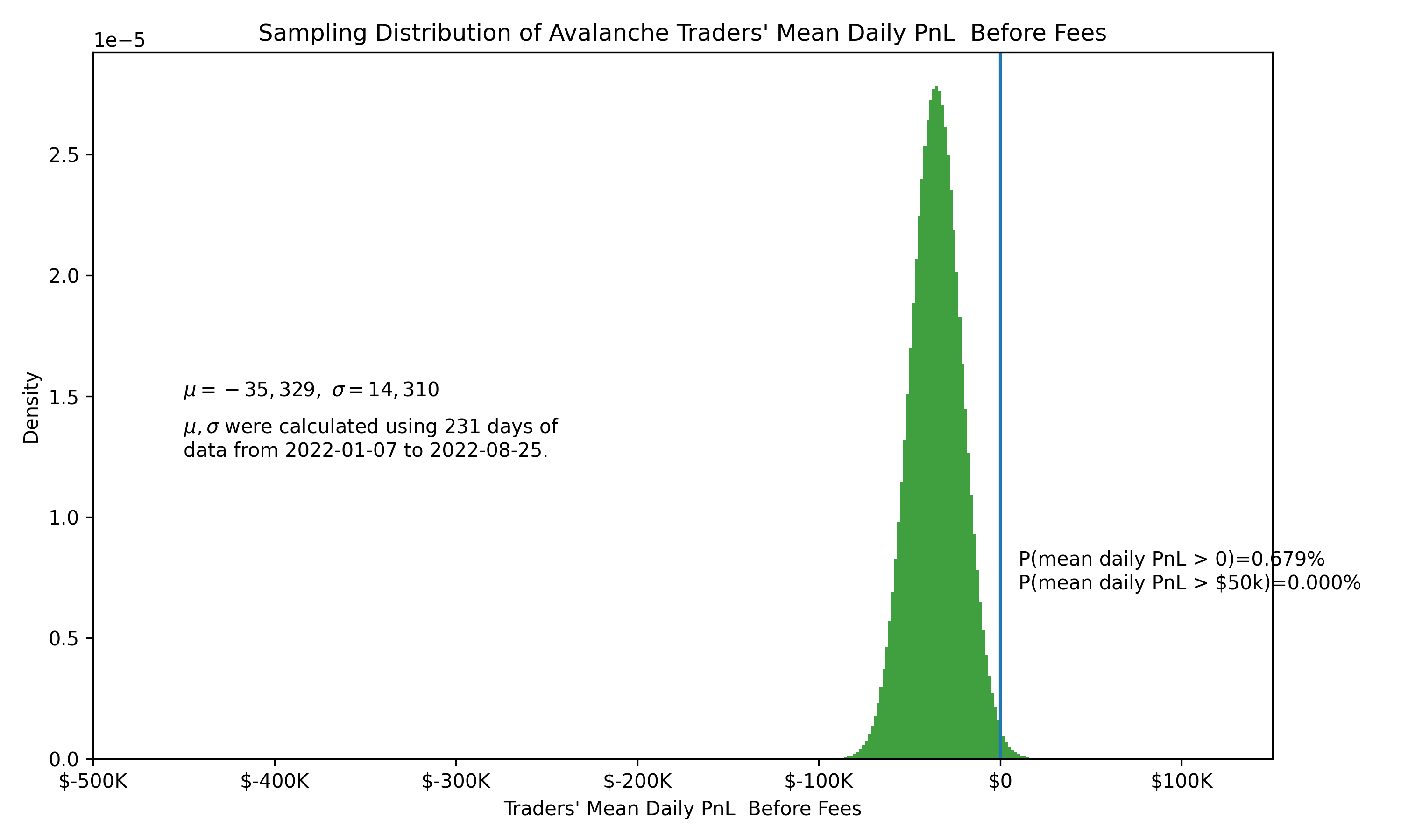 Before accounting for borrow and liquidation fees, for every 1,000 simulations of possible futures, there are ~7 of them where traders will on average make money. Yet the chances of traders on average making more than $50K per day is almost zero.